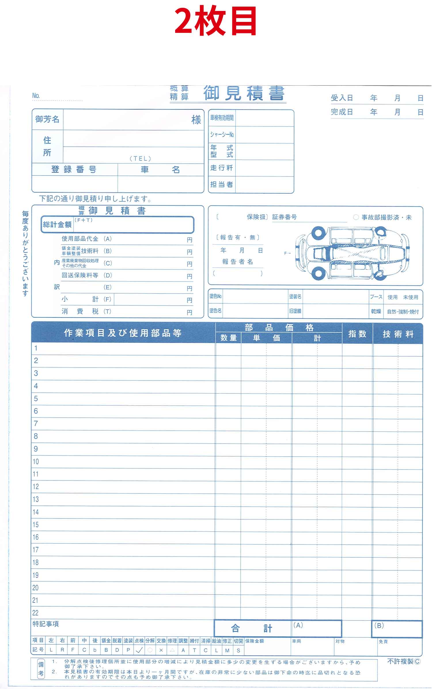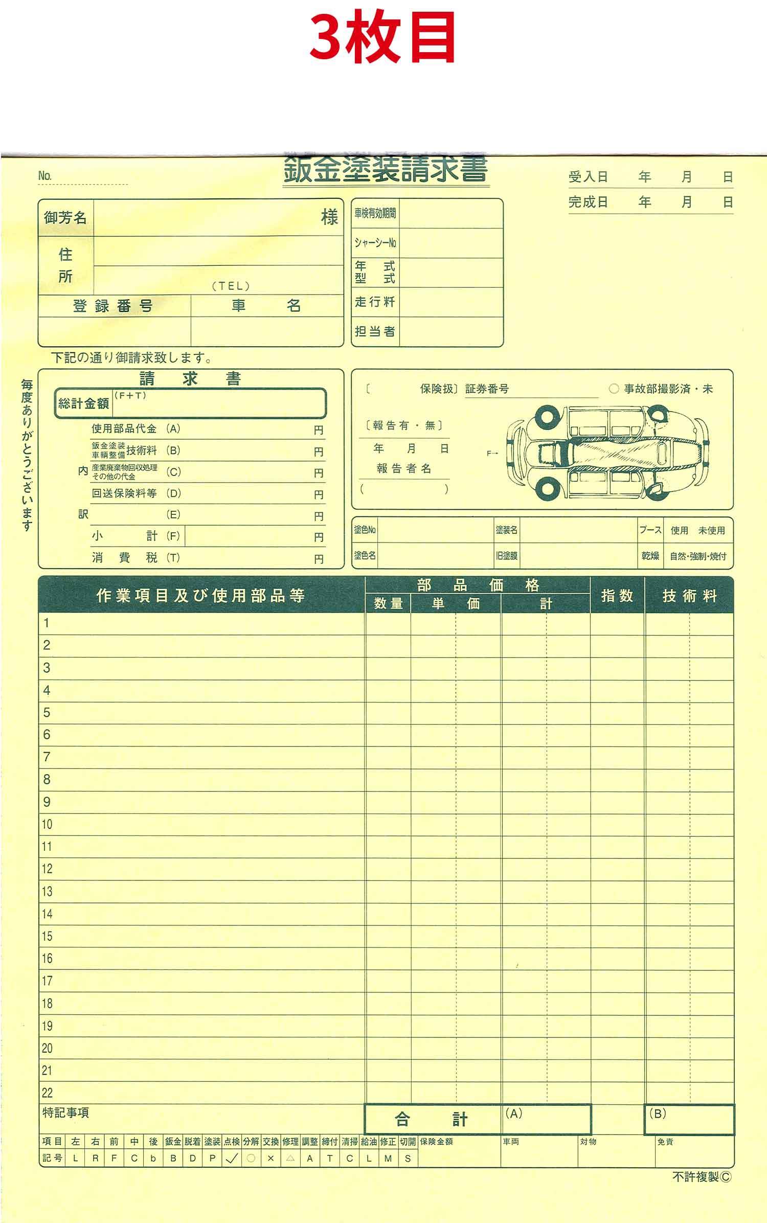 30組3枚複写(1枚目 鈑金塗装請求書控、2枚目 お見積書、3枚目 鈑金塗装請求書)縦位置